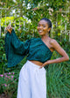 The Umfazi Top has a playful pattern and eye-catching silhouette.It will have you making an unforgettable impression everywhere you go - get ready to be showered with compliments! he top features a one-shoulder design and a long-sleeved cape sleeve